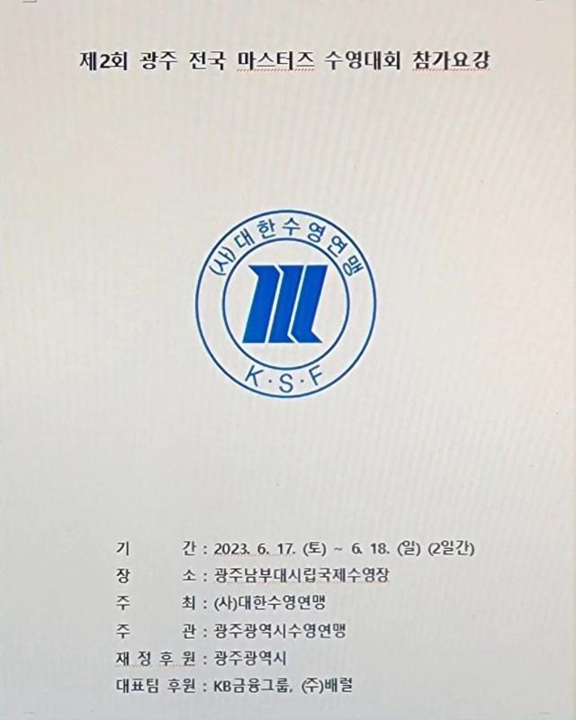 제2회광주전국마스터즈수영대회 제2회 광주 전국마스터즈수영대회 참가요강공지 참가신청시작 성인부는 조기마감예상 많은신청바랍니다 광주남부대국제수영장 대한수영연맹 광주광역시수영연맹 재정후원 광주광역시 kb금융그룹